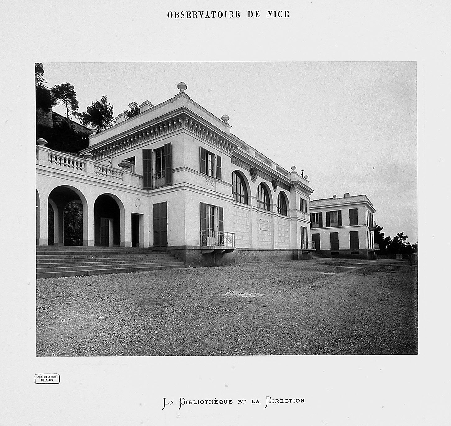 Édifié entre 1883-1887, le Pavillon Henri Chrétien est un grand bâtiment de l’administration et de la bibliothèque subtilement décoré. Sa terrasse offre un panorama exceptionnel sur la baie de Nice et la voûte céleste. Garnier conçoit l’édifice à l’échelle du site et l’inscrit dans le grand paysage. Le Pavillon Henri Chrétien, comme le Grand Equatorial (la Grande Coupole sur l’image) sont  clairement identifiables depuis la ville. La bibliothèque a été placée à égale distance de tous les édifices d’observation.