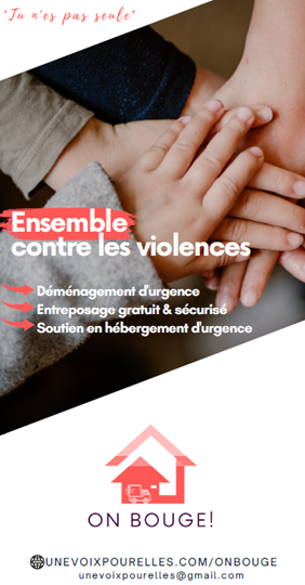 L’action «On bouge»  permet d’accompagner, dans les Alpes-Maritimes, toute femme victime de violences conjugales depuis son départ du domicile conjugal jusqu’à son relogement, en lui assurant un soutien matériel et logistique tout au long de sa reconstruction.